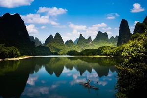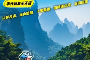 骑车饱览沿途喀斯特地貌群山。抵达兴坪后,可预留时间前往20元人民币拍摄点游玩,欣赏原生态渔舟唱晚景致,也可乘船远眺九马画山美景,或自由选择在附近码头乘坐竹排,晚宿兴坪古镇。