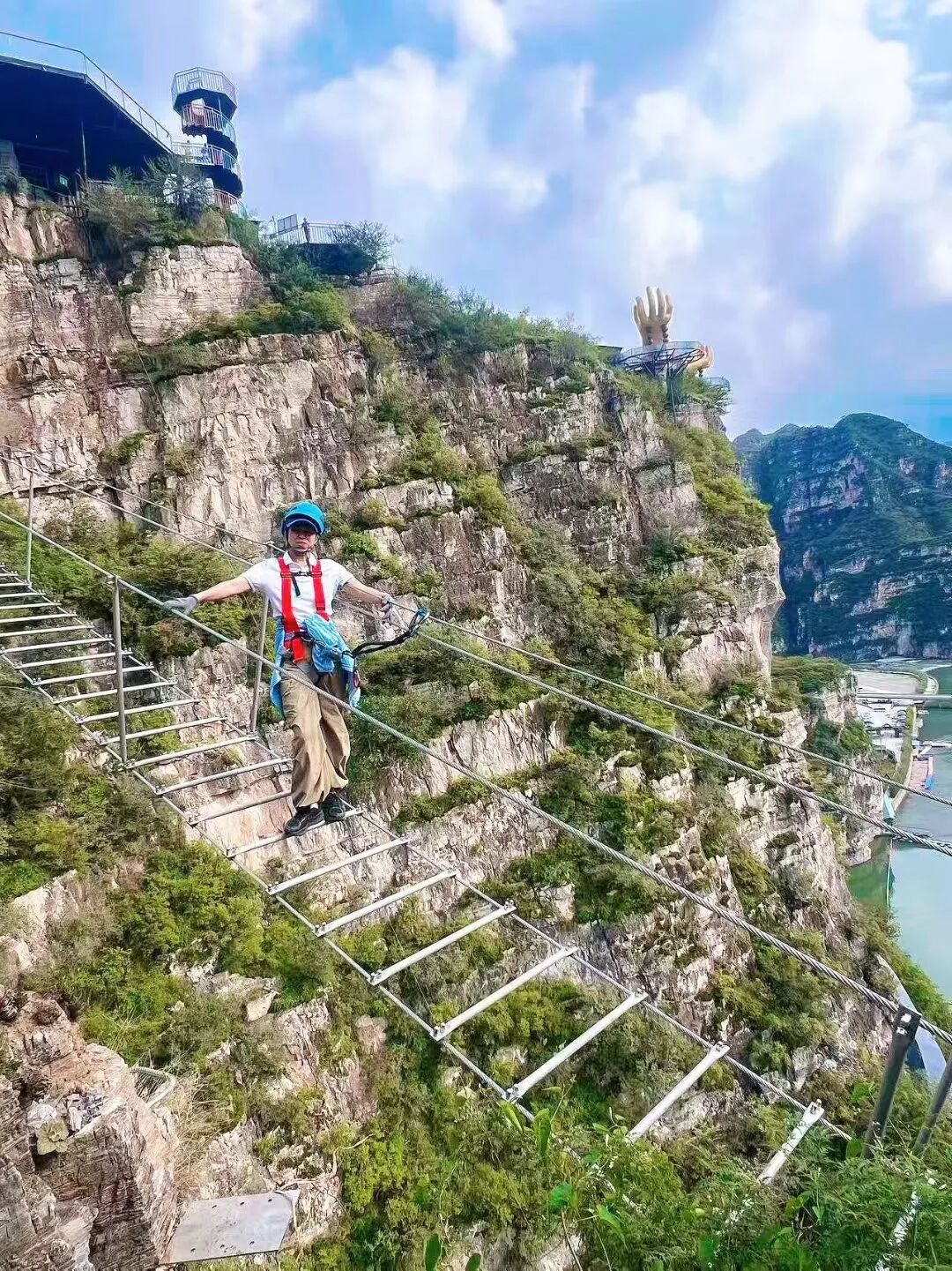 佛手观景台,是拍照打卡的绝佳点位,巨型佛手雕塑悬于崖外,站上去仿佛被托举半空,胆大者可挑战凌空漫步,体验加速心跳。