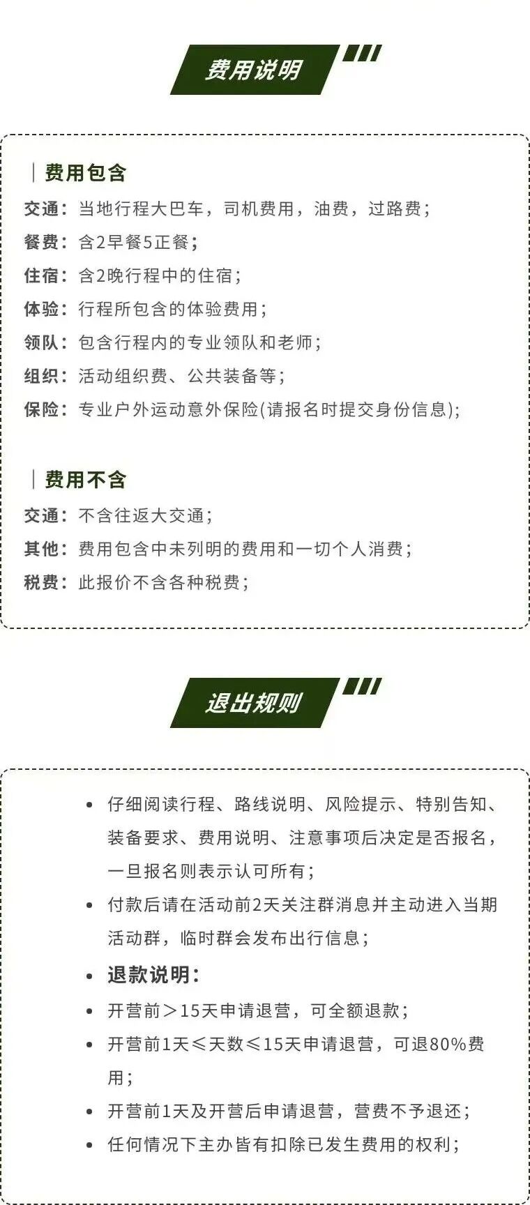 1.参加活动请按规定时间、地点集合,未按规定时间到达指定集合地点视为自愿放弃该活动,且不接受任何形式退款。