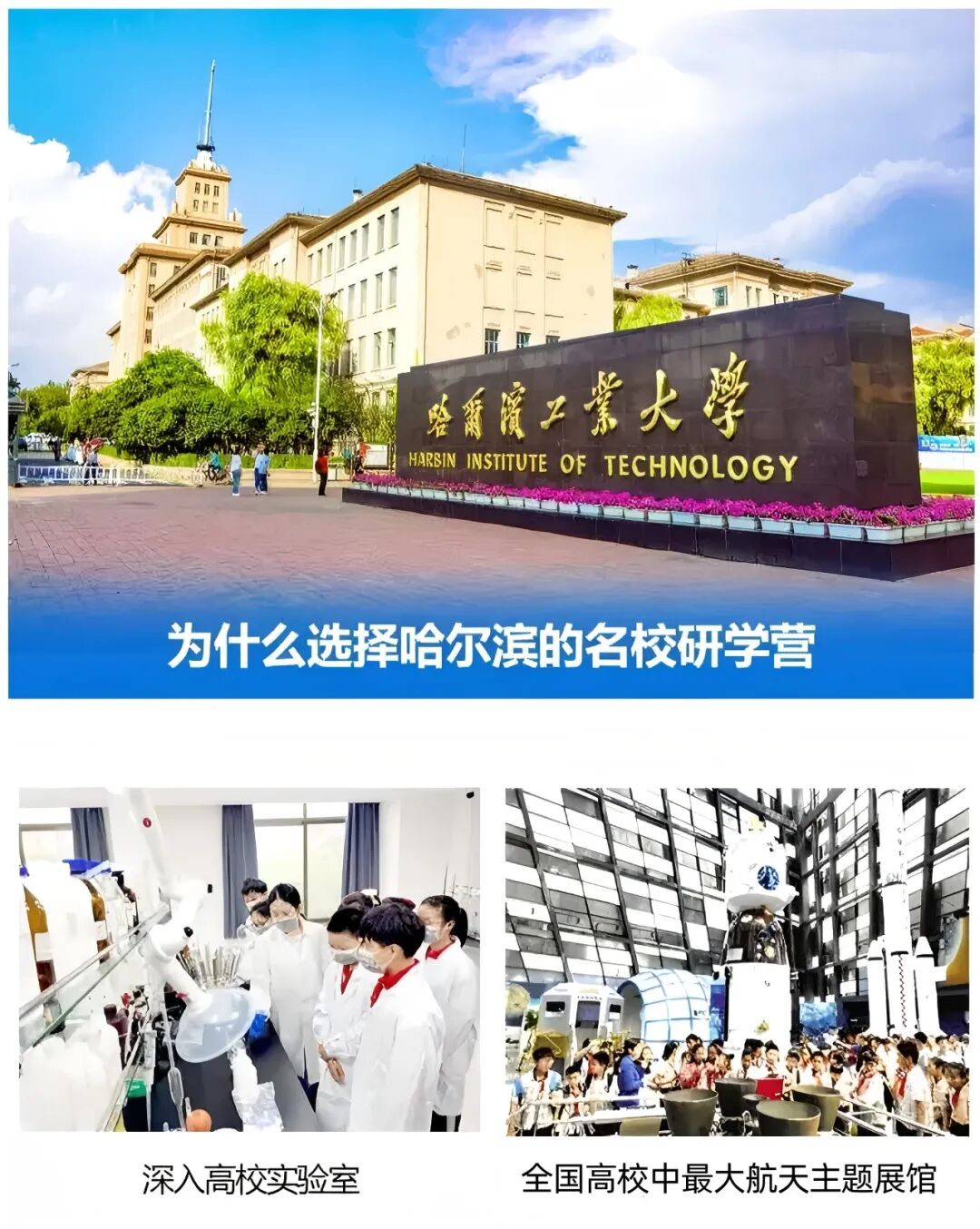 游:哈尔滨工业大学【航天馆】、【博物馆】,零距离接触珍贵实物与模型,中国第一航天院校独特文化、百年校史,【漫步校园】,感受高校文化。